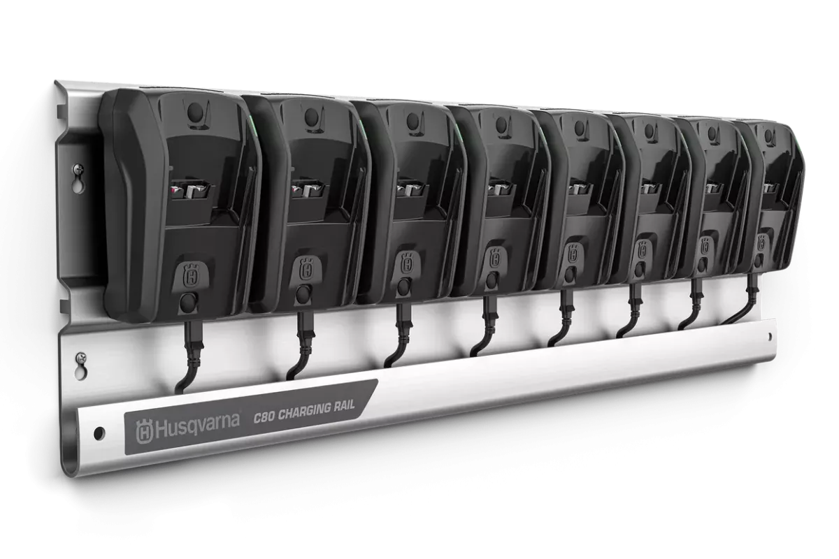 A Husqvarna 40-C80 töltőállomás kényelmes módot kínál akár 8db Husqvarna BLi 36 voltos akkumulátor egyidejű éjszakai töltésére. A töltőállomás a műhely falára szerelhető, hogy helyet takarítson meg, és biztonságosan a helyén tartja C80-as töltőit, összekuszálódott kábelek nélkül. A 8-1 kábelcsatlakozáshoz csak egy fali aljzat szükséges az áramellátáshoz. Csendes, mivel a töltés alacsony teljesítmény mellett történik, és nincs szükség hűtőventilátorra. A töltőállomás alumínium sínt, kábelt és nyolc C80-as töltőt tartalmaz.