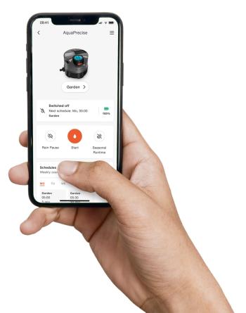 Az AquaPrecise kényelmes ütemezést kínál az integrált öntözésvezérlővel, amely lehetővé teszi az öntözési ciklusok egyszerű programozását. A FlowBalance szelep a beállított ütemezés szerint nyílik és zár. Teljes biztonsággal nyomon követheti az aktuális vízáramlást és fogyasztást, így biztosítva a pontos vízhasználatot. A rendszer Bluetooth® alkalmazáson keresztüli távirányítóval is rendelkezik, amely lehetővé teszi a beállítások módosítását és a kontúr programozását.